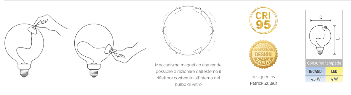 Si tratta di una lampadina innovativa che offre un approccio rivoluzionario nell'illuminazione grazie a un design con un riflettore interno orientabile. Questa lampadina a LED è dotata di un meccanismo magnetico che consente di direzionare il fascio luminoso all'interno del bulbo di vetro, consentendo agli utenti di regolare la direzione della luce in base alle proprie esigenze.