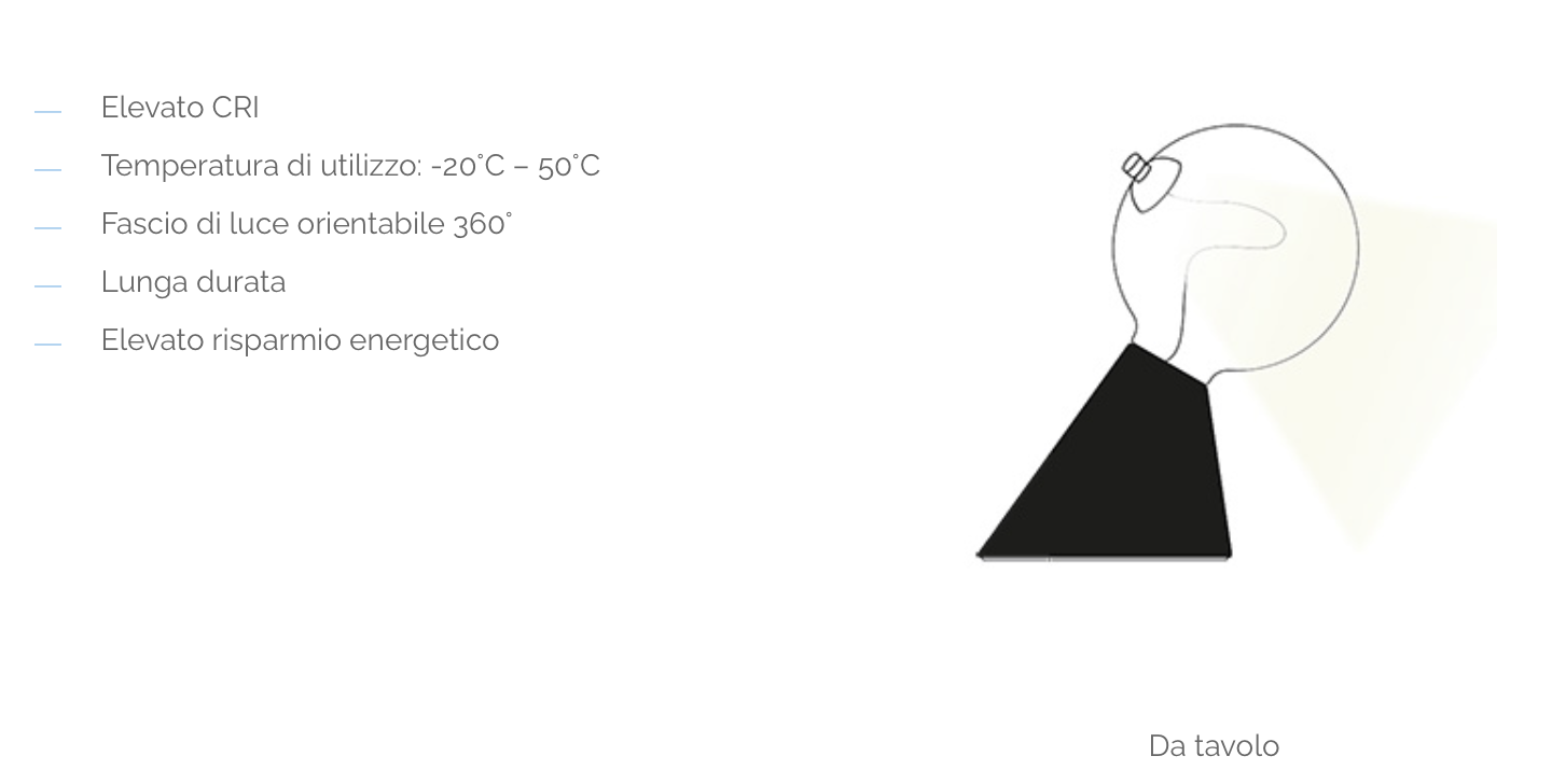 La sua caratteristica principale è la possibilità di personalizzare il fascio luminoso, consentendo la creazione di effetti di luce e ombra su diverse superfici, in modo flessibile e adattabile a vari contesti. La versatilità di questa lampadina la rende adatta sia per l'illuminazione di scrivanie e comodini, sia per l'illuminazione ambientale.